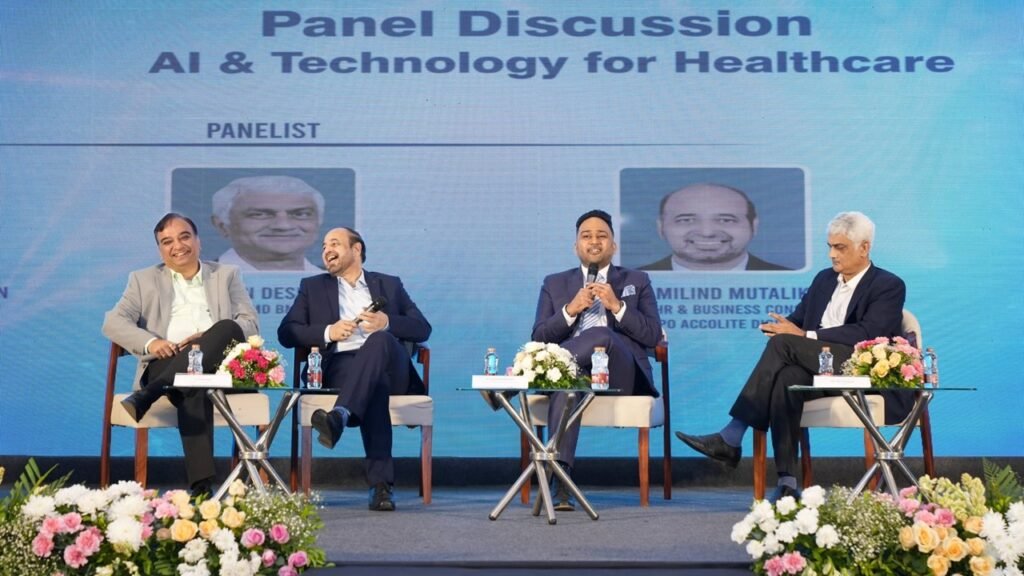 Post-lunch, the summit resumed with the session “AI & Technology for Healthcare”, featuring Dr. Sachin Devi, CEO, AIM Vision Technologies LLC (USA), Dr. Prashanth Balkesavan, Chairman & Managing Director, Pride Ventures (UAE), Mr. Nitin Deshpande, Former Managing Director, BMC, and Ms. Pallavi Jain, Executive Director, Krsnaa Diagnostics Ltd.